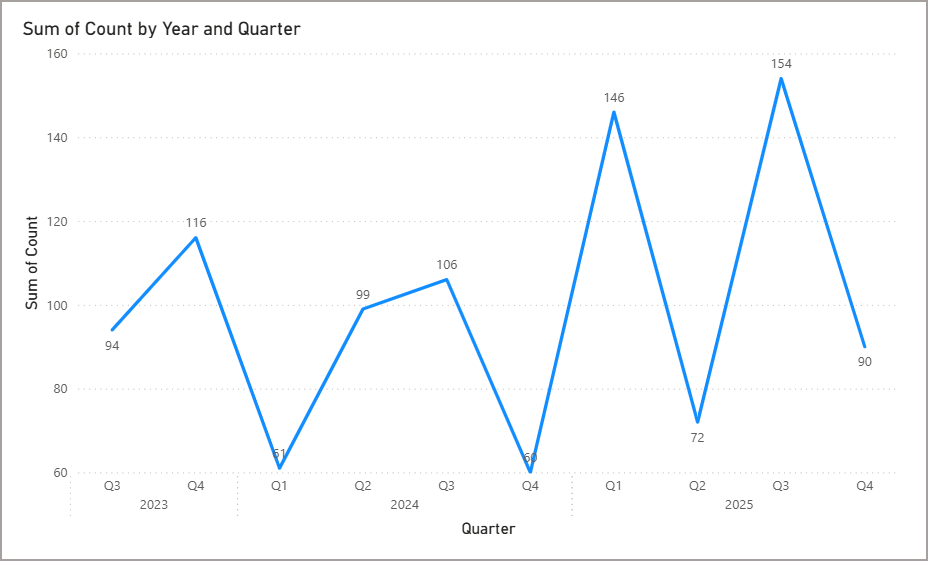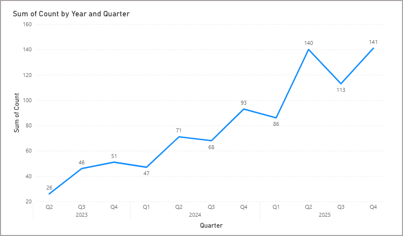 What about the Fabric platform updates themselves? After all, several blogs could be published on 1 new feature alone. As we can see, not a huge increase month-over-month but we still see growth in the number of individual platform updates describes in the monthly update blog (this is with Power BI specific updates removed from the chart, it’s just Fabric items). The dips are mostly end of year (hey, those MS folks need some time to unwind too) and the spikes are big conferences like Ignite and FabCon where big batches of platform updates are released.